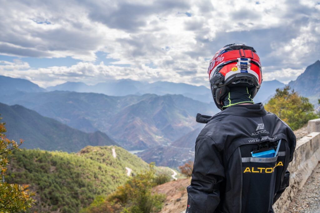 Wir sind im Flow und fahren ein wenig verwirrt vorbei. Nach einigen Kilometern drehen wir um– es lässt uns keine Ruhe. Die ersten 500 Meter des Abzweigs sind wirklich rau, und wir knüppeln da ganz schön hoch. Oben angekommen will Clemens noch ein paar Bilder machen und entdeckt, dass der UV-Filter am Objektiv seiner Kamera einen Schlag abbekommen hat. Das ist schon ein kurzer Schreckmoment. Es scheint aber so, als hätte die Mechanik des Objektivs nichts abbekommen. Wir buchen es unter „Wo gehobelt wird, fallen Späne“ ab.