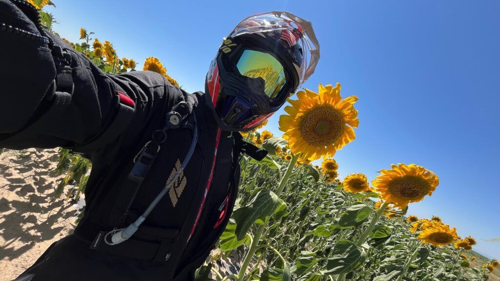 Ich habe immer 9 l Wasser im Gepäck – für den Tag und als Reserve. In der Jacke gibt es auf dem Rücken eine Wasserblase mit weiteren 2 l drin. Außerdem habe ich mir den halbvollen Tank als Sicherheitsmarke gesetzt, um zur nächsten Tankstelle fahren zu können.