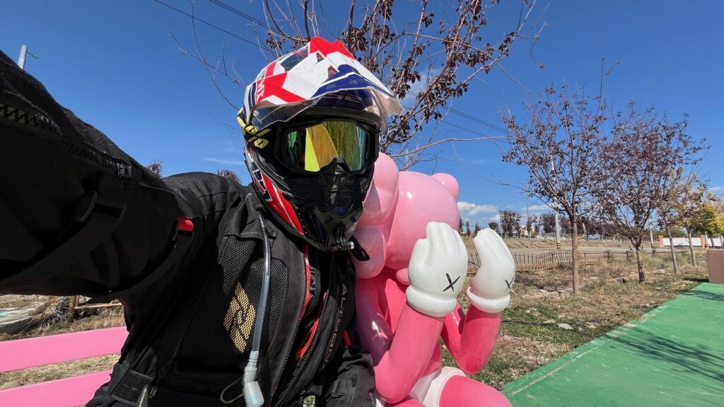 In der Region scheint es viele Bienen und Wespen zu geben. Überall in der Landschaft stehen Bienenkästen, und an jeder zweiten Ecke wird Honig verkauft. Ich mache lieber das Helmvisier zu – nicht, dass mir noch eine verirrte Biene in die Nasenspitze sticht.