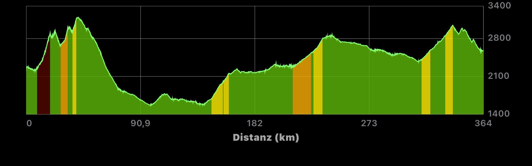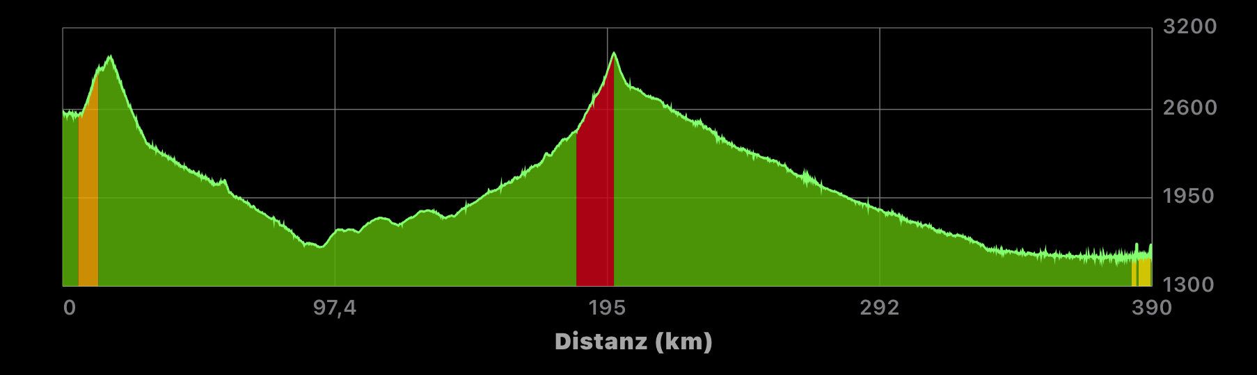 Strecke | 364 km (blau) | 389 km (gelb) |