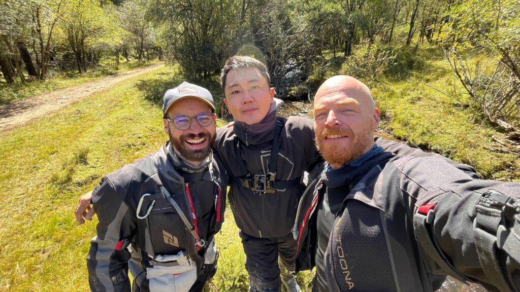 - Die besagte Wiese, die wir überqueren wollen, endet vor einem mehr oder weniger trockenen Bachlauf. Ich fahre vorweg und durch den Bach. Doch die Wiese dahinter ist extrem nass und durchsetzt mit großen, wassergefüllten Löchern– wie tief das Wasser dort steht, ist völlig unklar. Ich muss wirklich aufpassen, als ich mich durch die vielen Wasserlöcher schlängele. Langsamer werden kann ich dabei auch nicht– sonst würde ich mich im nassen Gras festfahren. Vor dem nächsten Bach stoppe ich. Der ist tiefer und breiter. Meine Überlegungen, ob wir da alle drei durchfahren können, unterbricht Clemens über den Helmfunk. Irgendetwas hat Max erwischt– also, er hat etwas erwischt, nicht umgekehrt. Ein Blick zurück verrät: Es handelt sich um das erste Wasserloch. Zum Glück ist es nur das Knie – und nicht der Kopf!