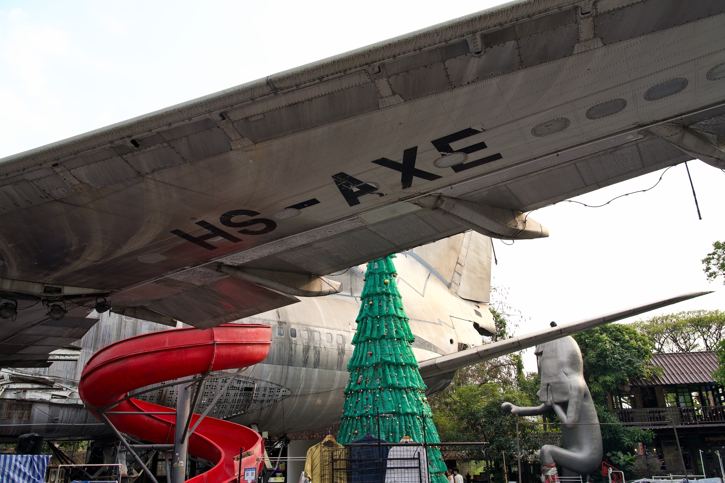 Für den späten Nachmittag und Abend planen wir, auf einem, ich nenne es mal, „Stadtteil-Markt“ zu sein. Den anderen Nasen, die wir so in der Stadt getroffen haben, sagen wir auch Bescheid. Wäre bestimmt lustig, da den einen oder anderen Drink zu nehmen. Der Markt ist auf dem Gelände einer ehemaligen innerstädtischen Mülldeponie entstanden. Das Gelände und der Boden wurden saniert, und ein altes Militärflugzeug wurde aufgebaut – man hat es von einer alten Basis in Einzelteile zerlegt und antransportiert! Am Ende bleiben wir gemütlich zu zweit inmitten Einheimischer dort und freuen uns über Essen und Getränke :).