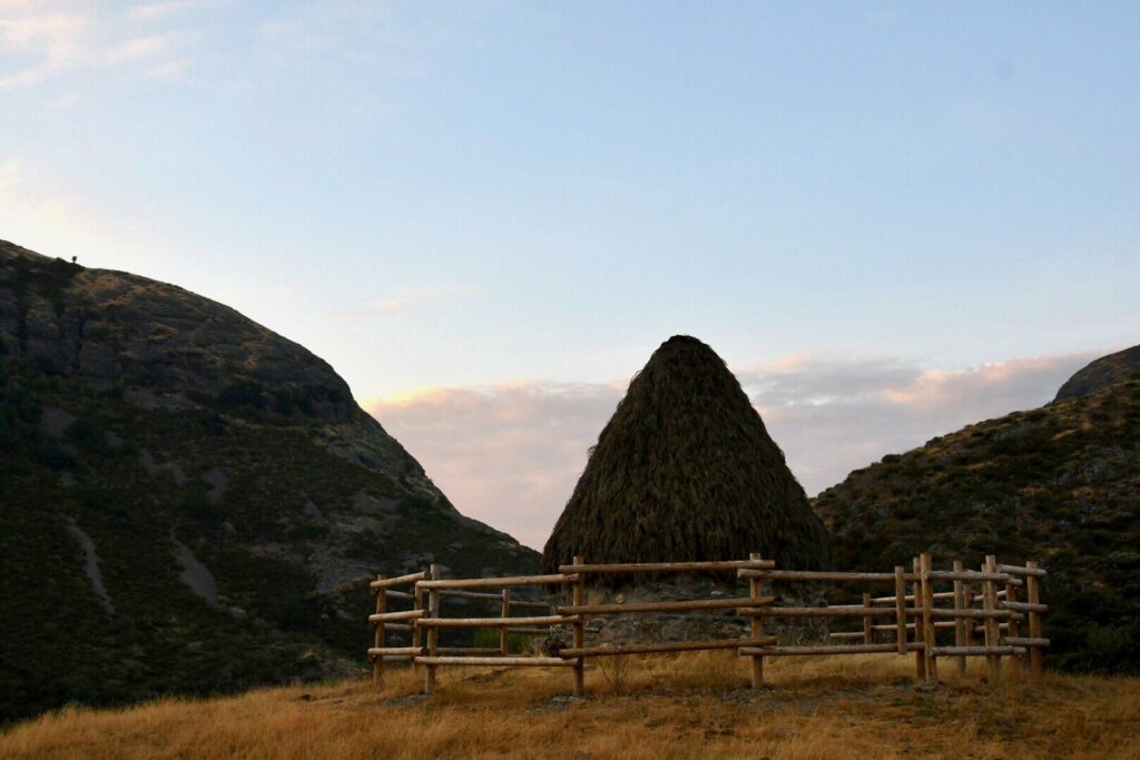 1.300 Meter Höhe und 7 Grad nachts sind normalerweise nicht wild. Wenn das Gepäck allerdings auf „Sommerurlaub“ ausgelegt wurde, ist das eine Ansage. Es wäre ein Tiefschlag, sollte die Standheizung irgendwann während einer Reise streiken. Heute Morgen ist das allerdings nicht der Fall und wir sitzen bei 22 Grad und Kaffee im Auto und schauen in den Morgen. Wir müssen vor der Abfahrt aus Neugier kurz ein Stück den Berg hochgehen, da wir aus der Ferne von der Landstraße einen ulkig aussehenden Bau gesichtet haben. Es handelt sich um eine Schutzhütte der Hirten. In der Region stehen immer mal wieder solche Gebäude herum. Diese hier scheint für Touristen schön hergerichtet worden zu sein- jedenfalls würde es mich wundern, wenn die alle so gut in Schuss wären und ein kleines Gatter drumherum hätten.