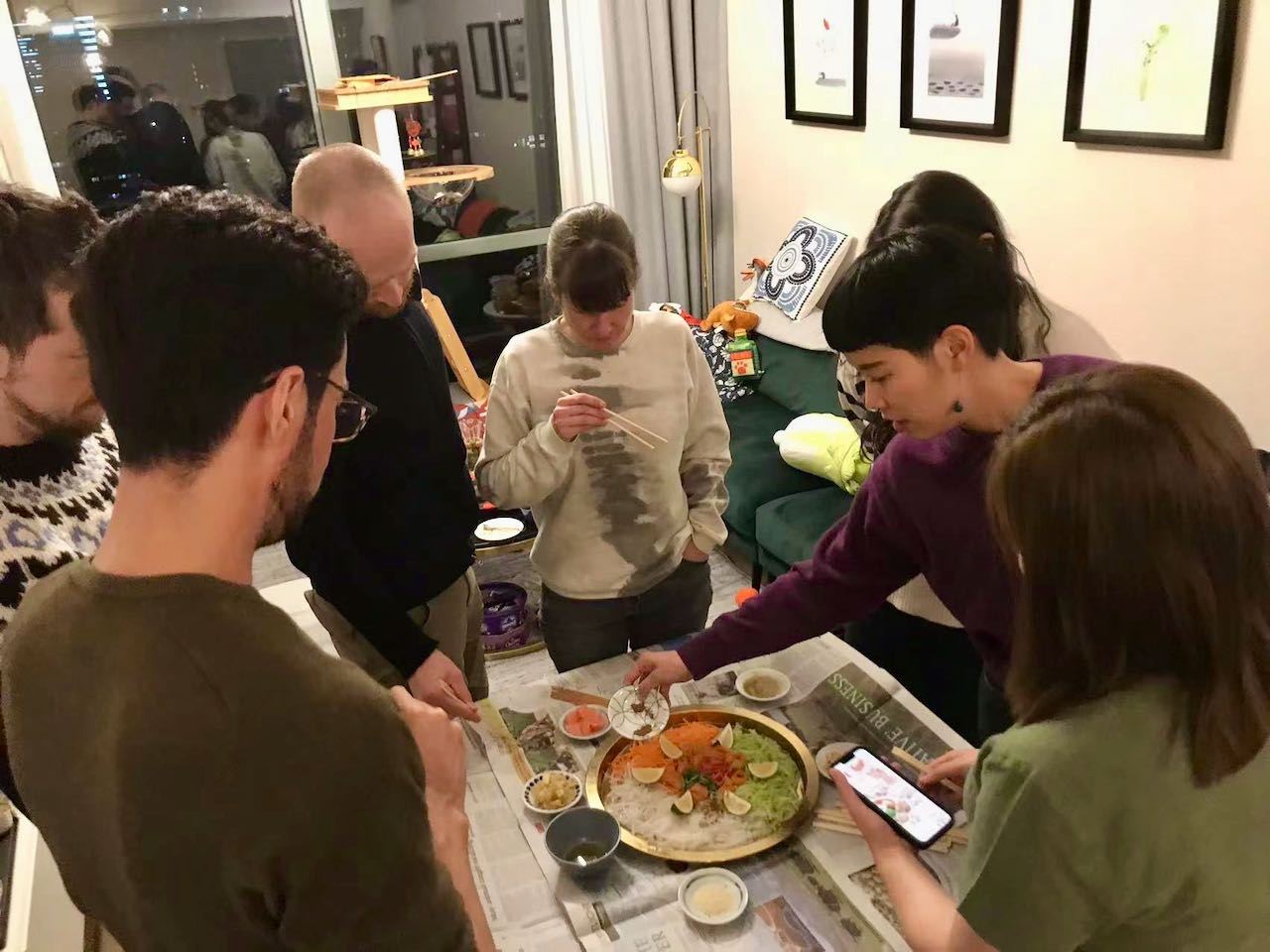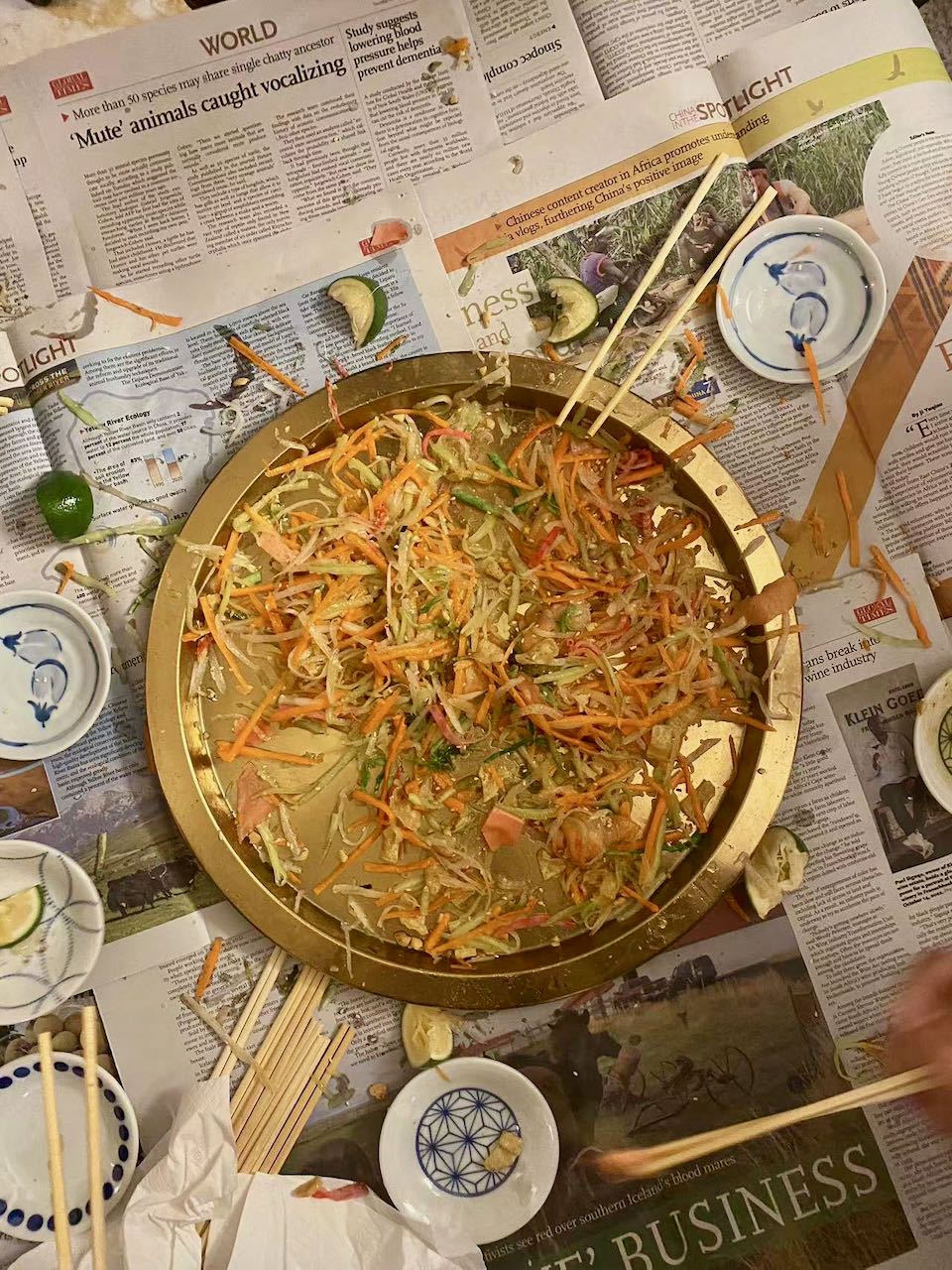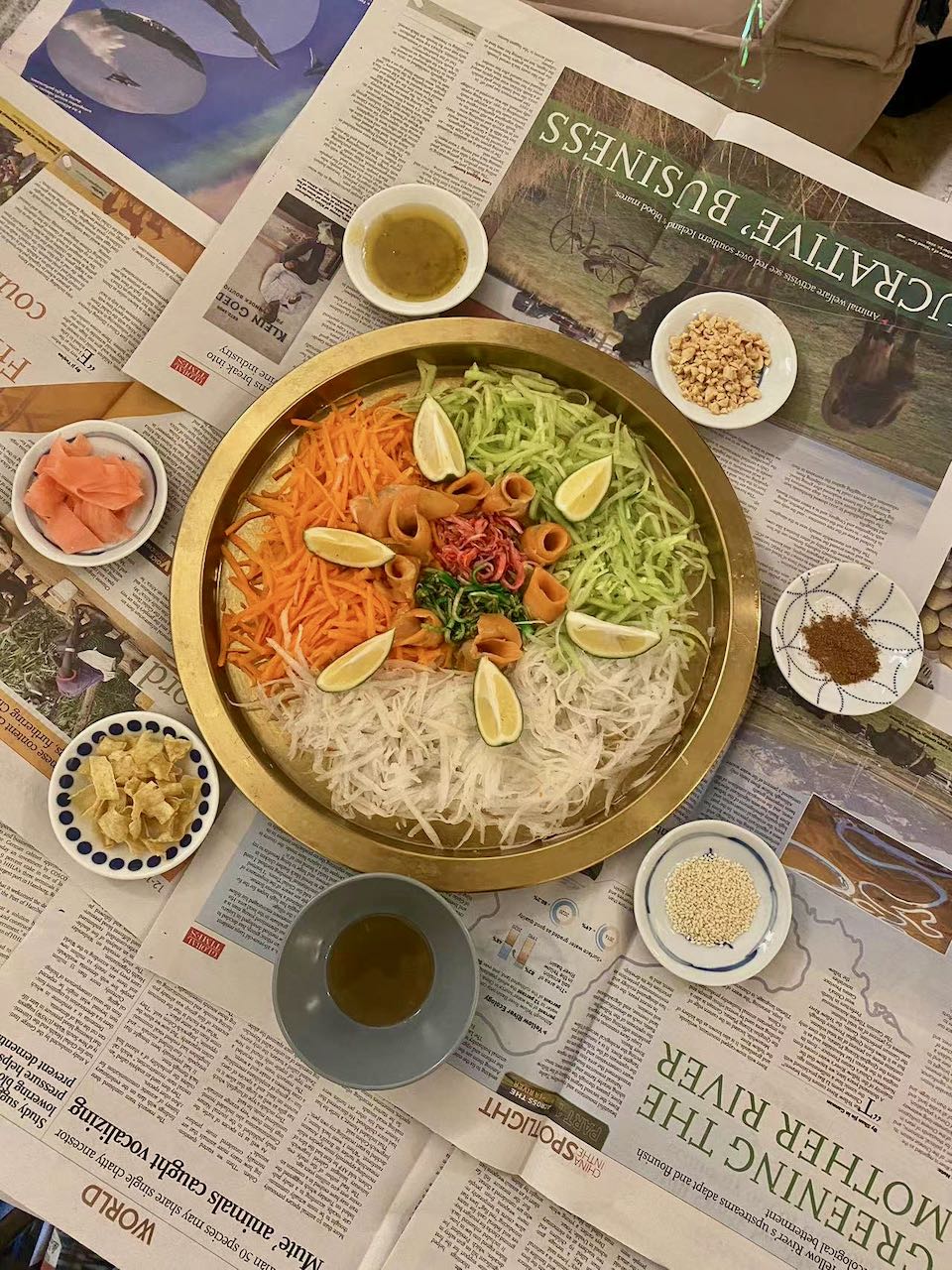 Chinesisches Neujahr Ich schrieb es, glaube ich, schon mal kurz. Da haben wir nun das quasi wichtigste Fest im Chinesischen Kalender und ziemlich jeder Chinese ist zu Hause seiner Familie. Die Stadt ist beinahe leer, die meisten Geschäfte und Restaurants geschlossen. Wir nutzen die Gelegenheit für eine schöne Runde auf dem Eis im Chaoyang Park und weil es so schön ist, nehmen wir noch einen Freund mit, der sonst als Strohwitwer allein gefrühstückt hätte. Wir alle freuen uns schon auf die Portion Baozi 包子 danach. Aber Pustekuchen, der Imbiss hat natürlich auch Ferien. Nächster Versuch: Brauhaus. Leichtfertig eigentlich, denn es herrscht eine seltsam euphorische Dynamik an diesem Tag in unserer kleinen Gruppe. Speis und Trank nahmen überhand, so dass alle Anwesenden definitiv zu spät und zu voll auf ihrer jeweiligen Folgeveranstaltung erschienen. Wiebke und ich haben im kleinen Kreis ein Chinesisches Neujahr nach Singapur-Tradition gefeiert. Als Höhepunkt wurde Salat in die Luft geworfen und die guten Vorsätze zum Verbrennen an die Wand genagelt (die Verbrennung erfolgte nicht an der Wand!). Ich war tief beeindruckt!