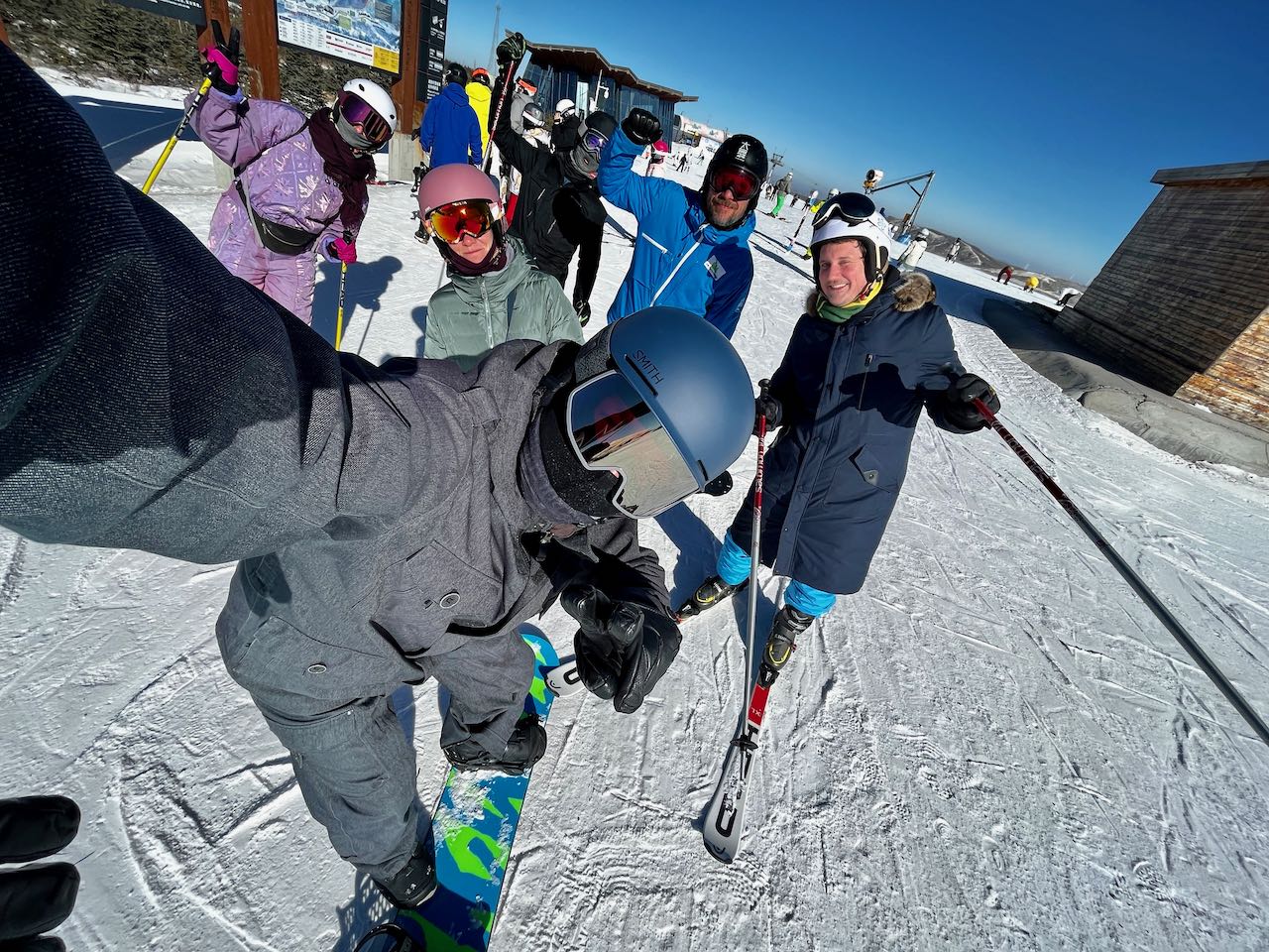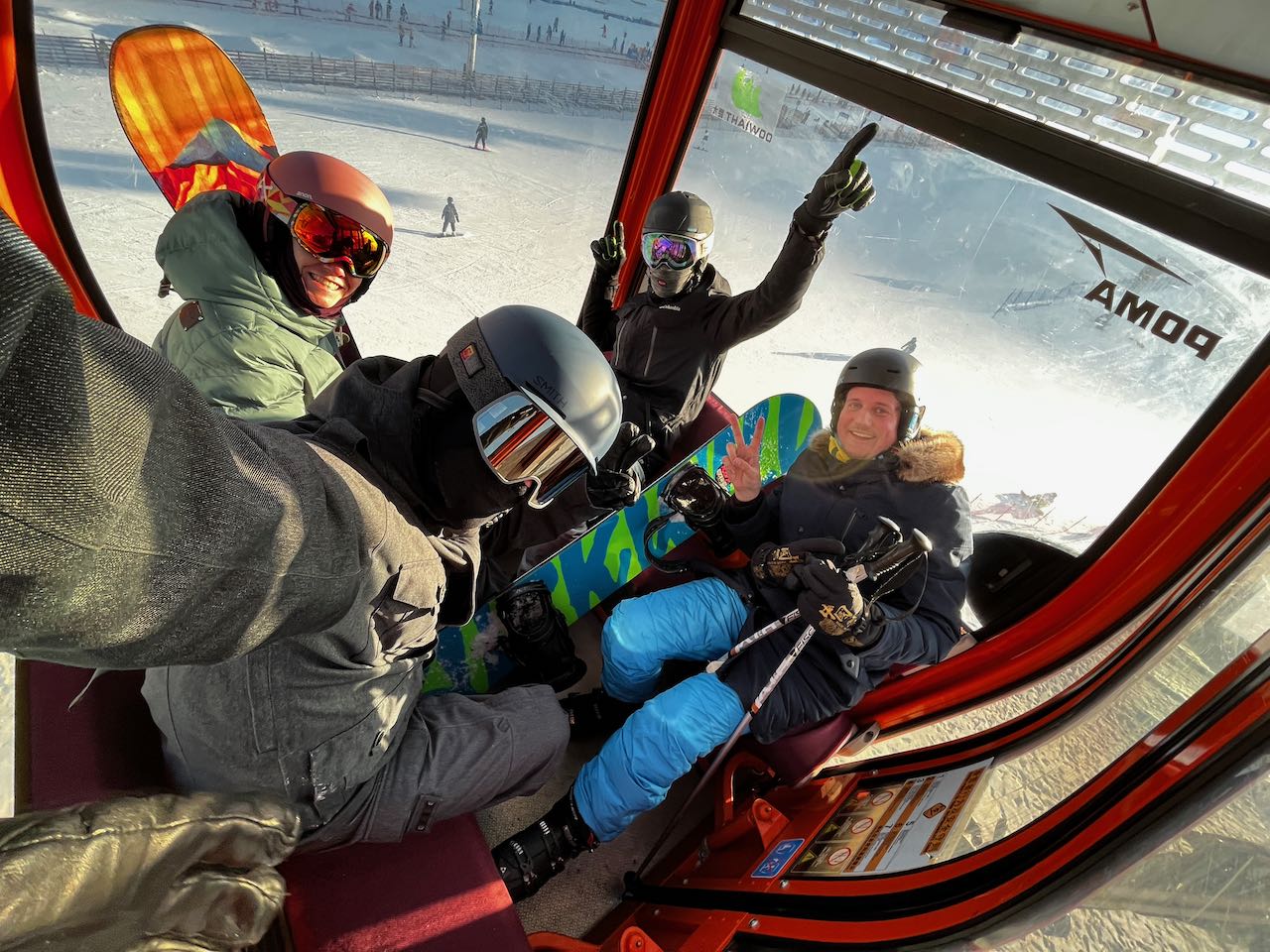 Ski-Freizeit Inspiriert von unseren guten Erfahrungen stiften wir Unruhe im Bekanntenkreis und schnell bildet sich eine richtige Reisegesellschaft von 12 Personen. Fahrer und Bus sind schnell gemietet- die "Klassenfahrt" geht los. Alle sind gut drauf, fragen sich jedoch hin und wieder was der Fahrer eigentlich beruflich macht. Er fährt wirklich schlecht. Wegen meiner Prellung am Hintern - im Grunde war die komplette linke Pobacke noch lila-blau gefärbt - musste ich vorsichtig snowboarden. Eine weitere Landung auf dem vorbelasteten Körperteil konnte ich nicht riskieren. Es kommt natürlich, wie es kommen muss ...