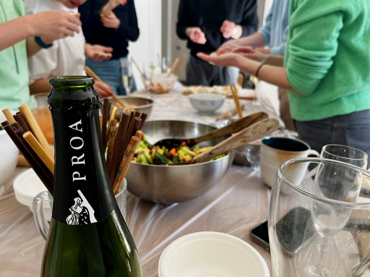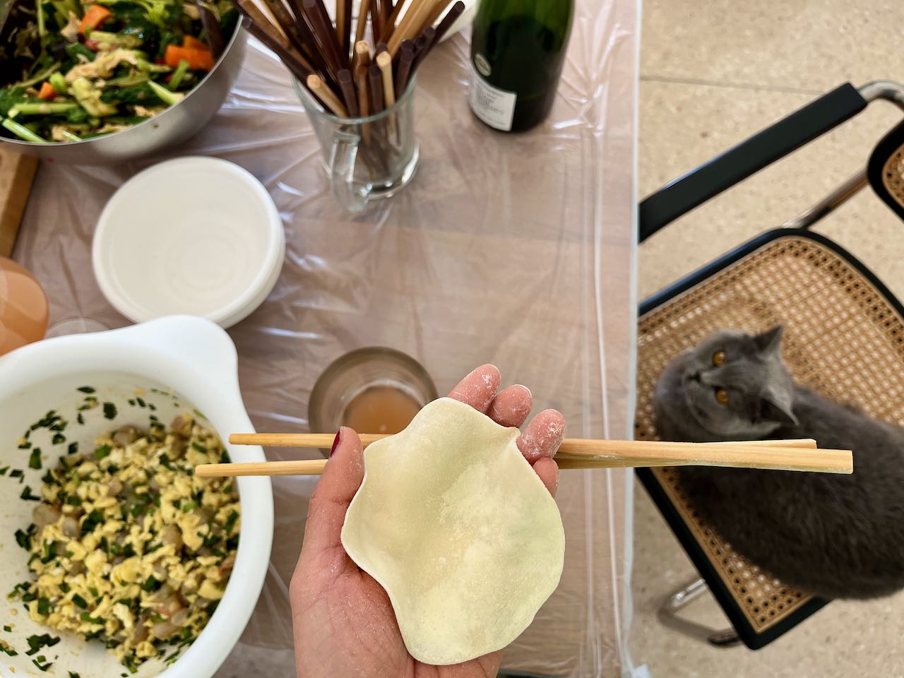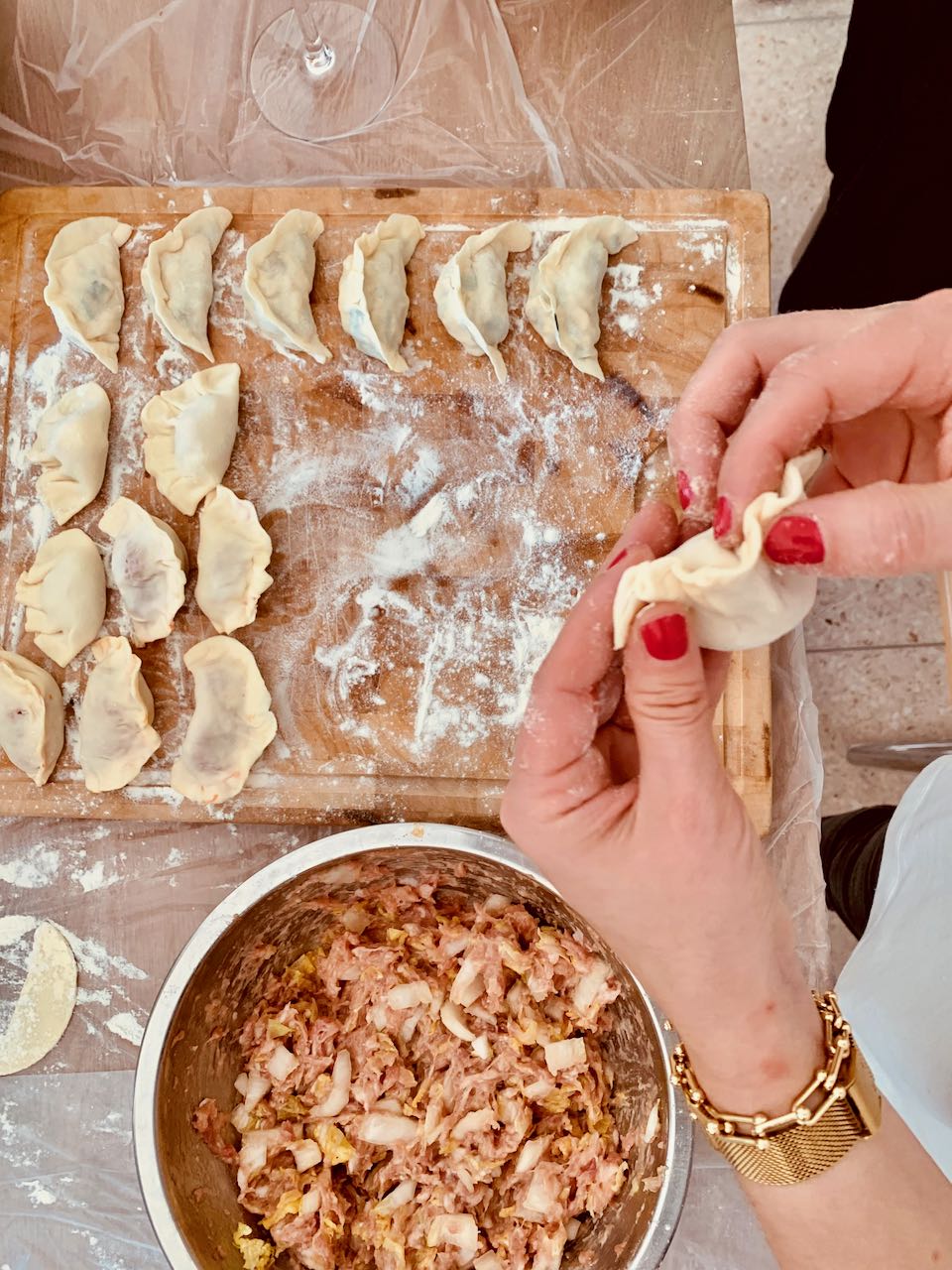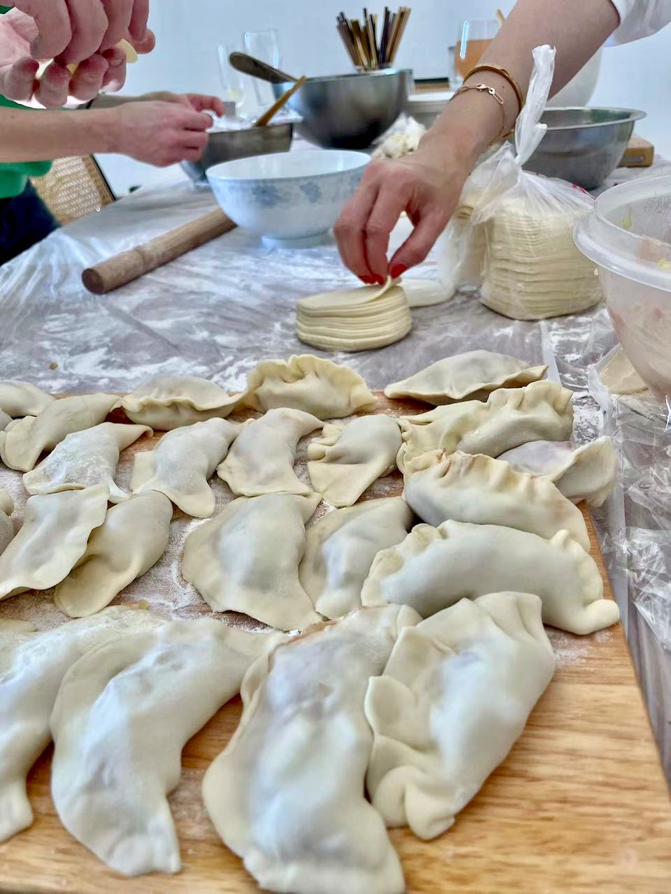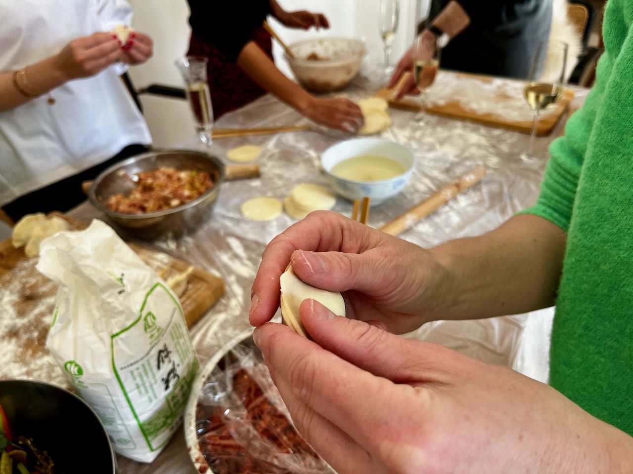 Hin und wieder wird in geselliger Runde gekocht, geklönt und dabei auch ein büschn Sekt getrunken. Freunde hatten für Sonntag zum „Knödel machen“ eingeladen. Der Teig wurde fertig gekauft, den Salat und die Füllungen haben wir alle gemeinsam zubereitet. Diese chinesischen Knödel heissen Jiaozi (饺子). Es gibt noch diverse andere Varianten und Formen, je nach Anlass und Tageszeit: rund oder fluffig, süß oder sauer, zum Mittag für zwischendurch oder zum Frühstück. Im Grunde sind das alles grob Jiaozi (饺子) oder Baozi (包子). Auf die Details kommt es an. Wir sind große Fans!!