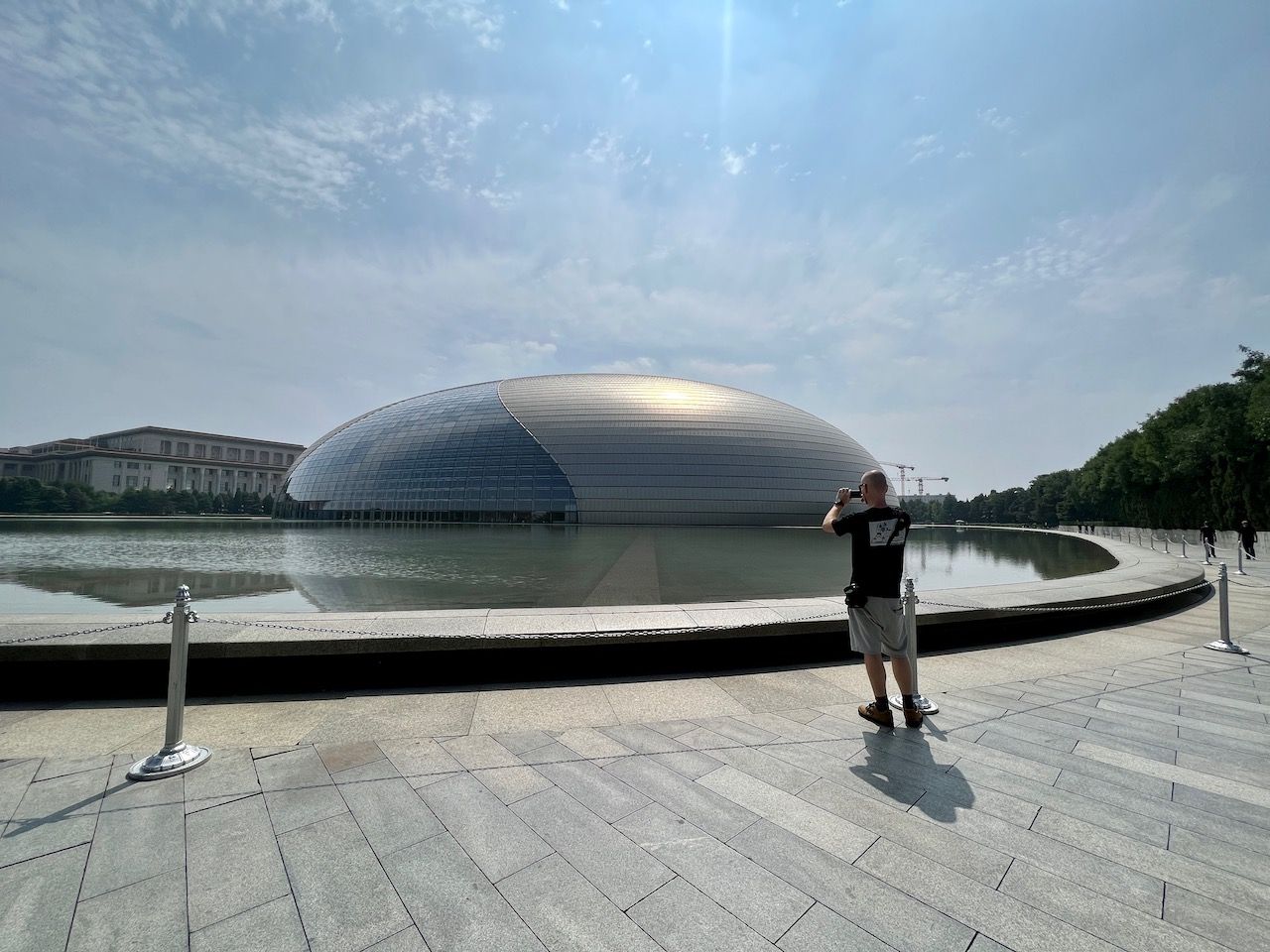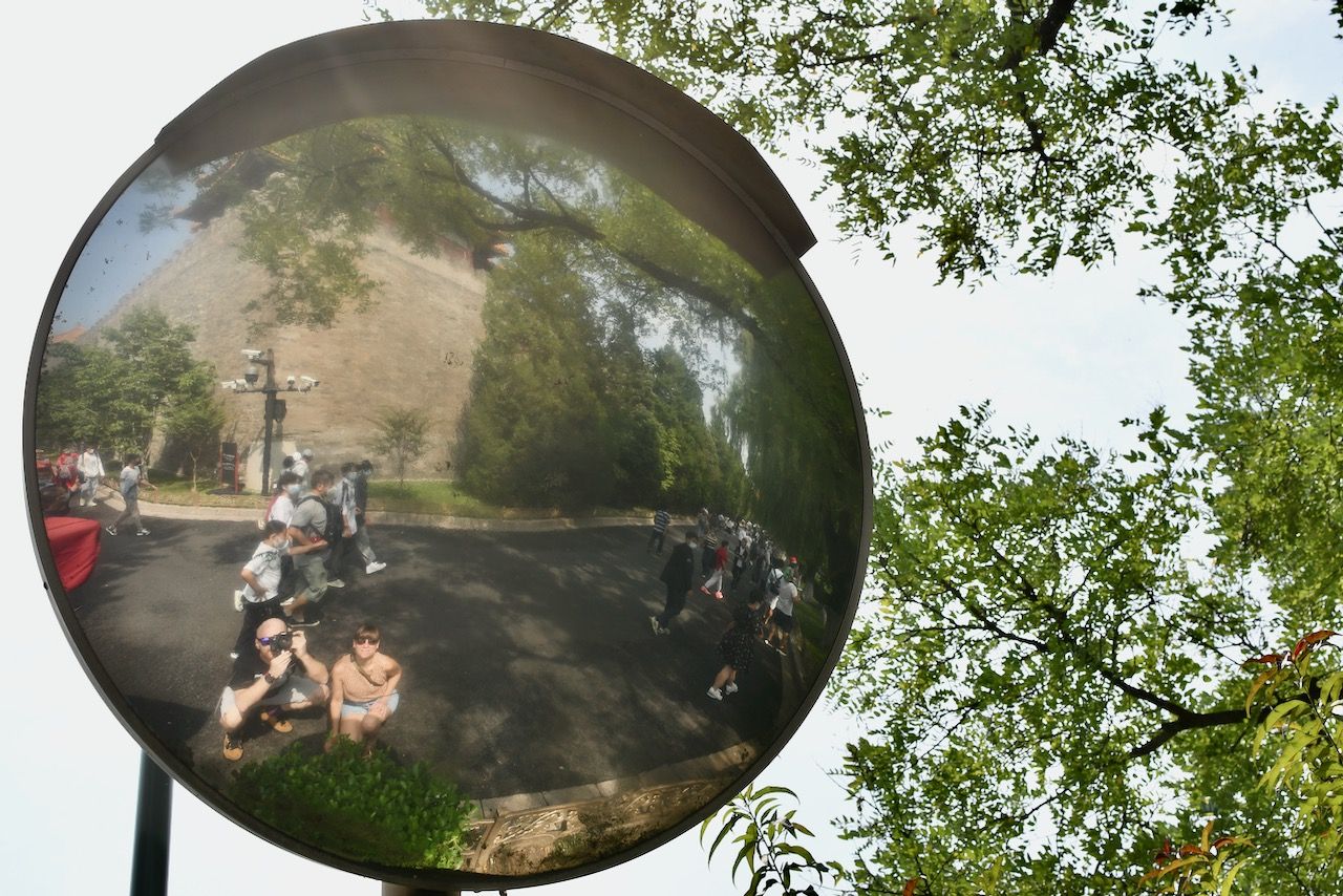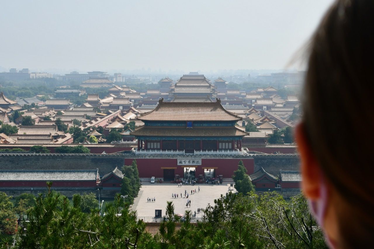 Ich hab spontan einen Tag frei- das wär doch mal ein guter Tag für die Verbotene Stadt, dann ist es bestimmt nicht so voll! Wir radeln mit unseren Bikes ins Zentrum und laufen an der gewaltigen Außenmauer der Verbotenen Stadt entlang zum Eingangsbereich. Doch sehr voll irgendwie und eine Ticketbude ist auch nicht in Sicht… eine Frau erzählt uns dann, dass für heute alles ausverkauft ist und sie auch schon nicht mehr reinkommt. Ob irgendwas besonderes los ist, bekommen wir nicht heraus. Dann gibt es eben eine Planänderung und wir fahren erstmal Richtung Tian’anmen-Platz. Für mich ist es mit dem Journalisten-Visum nicht ohne weiteres möglich, den Platz zu besuchen, aber daran entlang radeln geht! Anhalten ist allerdings strengstens verboten und alles ist wirklich rigoros abgeriegelt. Die Straße ist gewaltig groß und der Platz auch, sehr beeindruckend und auch irgendwie bedrückend. In der Nähe ist das eiförmige National Centre for Performing Arts, wo wir einen kleinen Stopp einlegen. Dann gibt es an einer der vielen kleinen Snackbuden Pekings erstmal einen leckeren Pfannkuchen. Die sind hier deftig mit viel Ei, Kräutern, Gemüse, Fleisch und Soßen. Danach radeln wir zum Jingshan Park. Dort gibt es einen der wenigen Hügel im Stadtbezirk. Der besteht aus dem Boden, der für den Festungsgraben der Verbotenen Stadt ausgehoben wurde. Von dort hat man einen schönen Blick über die Dächer des Kaiserpalasts. Wenn man denn reinkommt. Das zieht sich nämlich etwas, da das Health Kit eine Weile überlastet ist. Das ist die App, mit der wir uns überall, im Supermarkt, im Wohnblock, im Restaurant usw., und eben auch im Park einscannen müssen. Dort ist der letzte PCR-Test (alle zwei bis drei Tage) hinterlegt. Nach einigen Minuten Rumgetippe auf dem Handy und der Hilfe einer ganzen Traube von Leuten geht es dann irgendwann plötzlich wieder. Der Park ist eine richtige kleine Oase mitten in der Stadt. Die Rentner machen Tai Chi und fuchteln mit einem Brummkreisel rum. Micha führt ein lustiges Gespräch auf Chinesisch über Frankfurt und Mercedes Benz. Am Nachmittag gucke ich mir noch die große Einkaufsstraße Wangfujing an (nicht schön!) und erkunde noch ein paar Hutongs. Da ist es dann wieder sehr schön!