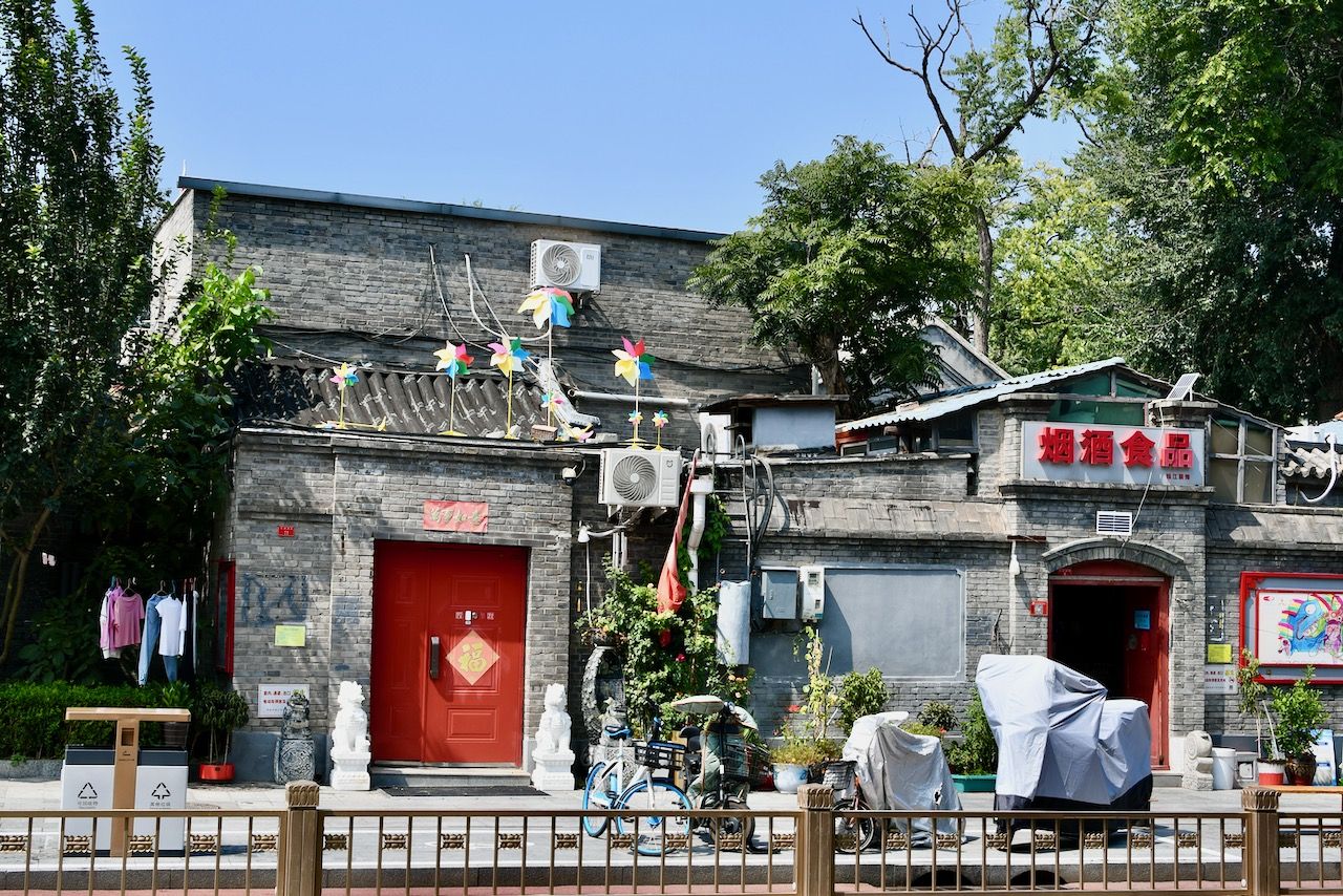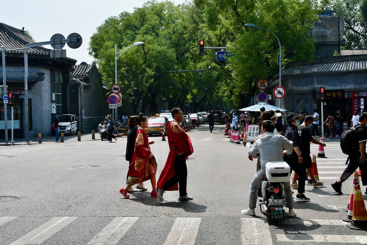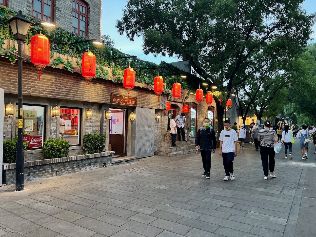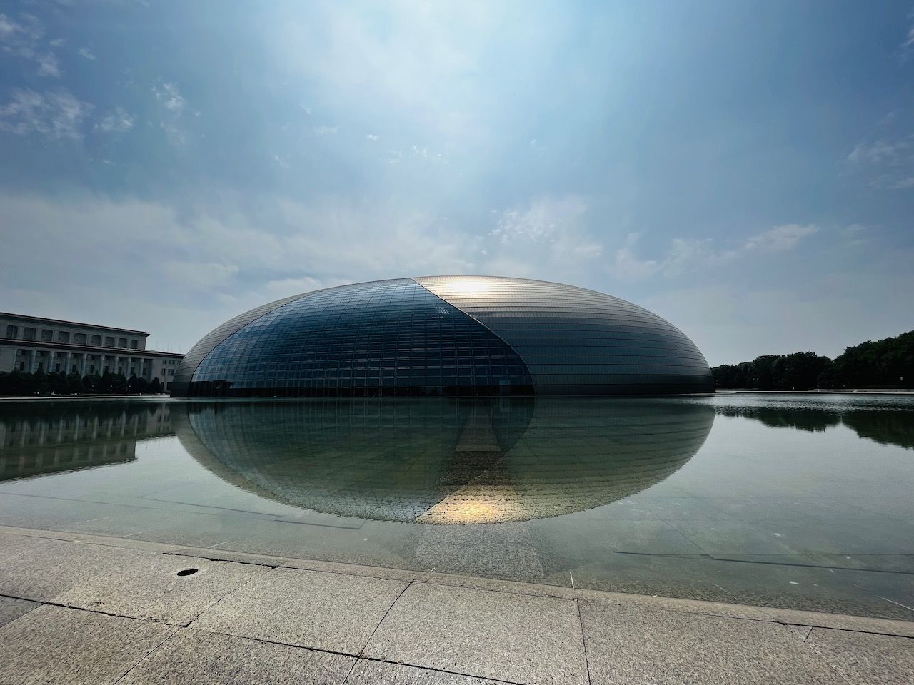 Ich hab spontan einen Tag frei- das wär doch mal ein guter Tag für die Verbotene Stadt, dann ist es bestimmt nicht so voll! Wir radeln mit unseren Bikes ins Zentrum und laufen an der gewaltigen Außenmauer der Verbotenen Stadt entlang zum Eingangsbereich. Doch sehr voll irgendwie und eine Ticketbude ist auch nicht in Sicht… eine Frau erzählt uns dann, dass für heute alles ausverkauft ist und sie auch schon nicht mehr reinkommt. Ob irgendwas besonderes los ist, bekommen wir nicht heraus. Dann gibt es eben eine Planänderung und wir fahren erstmal Richtung Tian’anmen-Platz. Für mich ist es mit dem Journalisten-Visum nicht ohne weiteres möglich, den Platz zu besuchen, aber daran entlang radeln geht! Anhalten ist allerdings strengstens verboten und alles ist wirklich rigoros abgeriegelt. Die Straße ist gewaltig groß und der Platz auch, sehr beeindruckend und auch irgendwie bedrückend. In der Nähe ist das eiförmige National Centre for Performing Arts, wo wir einen kleinen Stopp einlegen. Dann gibt es an einer der vielen kleinen Snackbuden Pekings erstmal einen leckeren Pfannkuchen. Die sind hier deftig mit viel Ei, Kräutern, Gemüse, Fleisch und Soßen. Danach radeln wir zum Jingshan Park. Dort gibt es einen der wenigen Hügel im Stadtbezirk. Der besteht aus dem Boden, der für den Festungsgraben der Verbotenen Stadt ausgehoben wurde. Von dort hat man einen schönen Blick über die Dächer des Kaiserpalasts. Wenn man denn reinkommt. Das zieht sich nämlich etwas, da das Health Kit eine Weile überlastet ist. Das ist die App, mit der wir uns überall, im Supermarkt, im Wohnblock, im Restaurant usw., und eben auch im Park einscannen müssen. Dort ist der letzte PCR-Test (alle zwei bis drei Tage) hinterlegt. Nach einigen Minuten Rumgetippe auf dem Handy und der Hilfe einer ganzen Traube von Leuten geht es dann irgendwann plötzlich wieder. Der Park ist eine richtige kleine Oase mitten in der Stadt. Die Rentner machen Tai Chi und fuchteln mit einem Brummkreisel rum. Micha führt ein lustiges Gespräch auf Chinesisch über Frankfurt und Mercedes Benz. Am Nachmittag gucke ich mir noch die große Einkaufsstraße Wangfujing an (nicht schön!) und erkunde noch ein paar Hutongs. Da ist es dann wieder sehr schön!